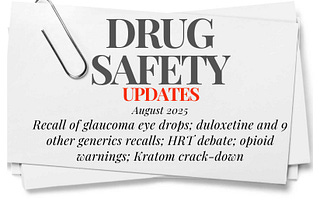 August 2025 Drug Safety: Huge Recall of Glaucoma Eye Drops; Duloxetine and Other Generic Recalls; HRT Comments; Opioid and Kratom 7-OH…