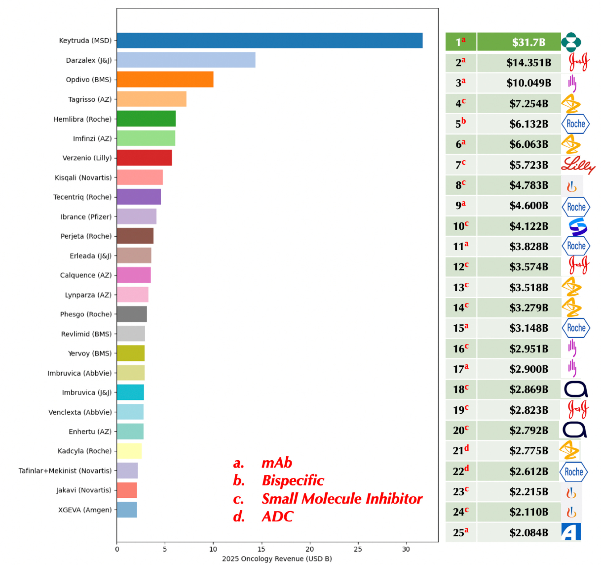 The top-selling drug in the world with over $31 billion in sales, Keytruda was just approved for an additional cancer indication: ovarian cancer. It is also now available for subcutaneous injection as Keytruda QLEX. This chart from Senthil Ramanathan Ph.D. shows rankings of oncology drugs by worldwide revenue in billions.