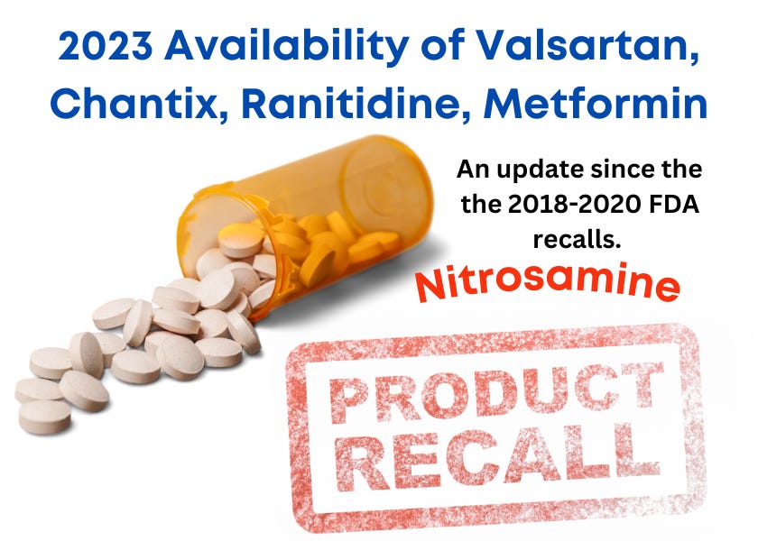 Starting back in July 2018, drug regulators worldwide began to recall certain blood pressure drugs containing valsartan (an Angiotensin II Receptor Blocker, or ARB) because of traces of nitrosamine detected at levels thought to be potentially carcinogenic (cancer causing) to humans. Over the next few years, additional generic and brand name drugs with nitrosamine impurities linked to manufacturing facilities in China and India were recalled. Here is a list of those drugs, along with current availability status.